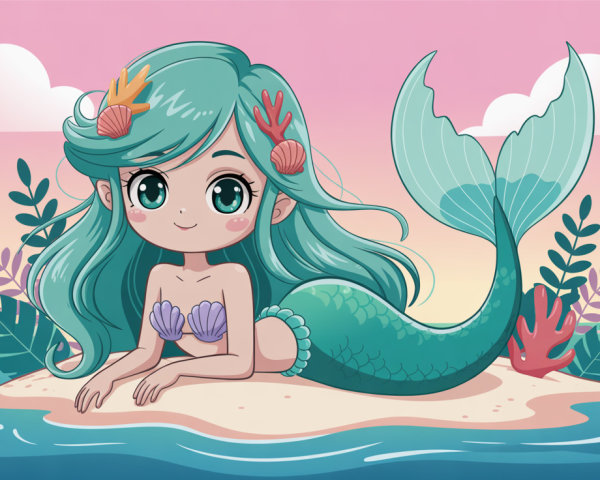 A whimsical scene unfolds as a charming anime mermaid perches playfully on a military tank, her vibrant tail contrasting with the rugged metal. The setting blends fantasy with an unexpected twist of strength.