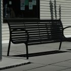 A wooden slat bench with curved metal arms sits on a paved surface, partially shaded by nearby architecture, creating a serene spot for relaxation in an outdoor setting.