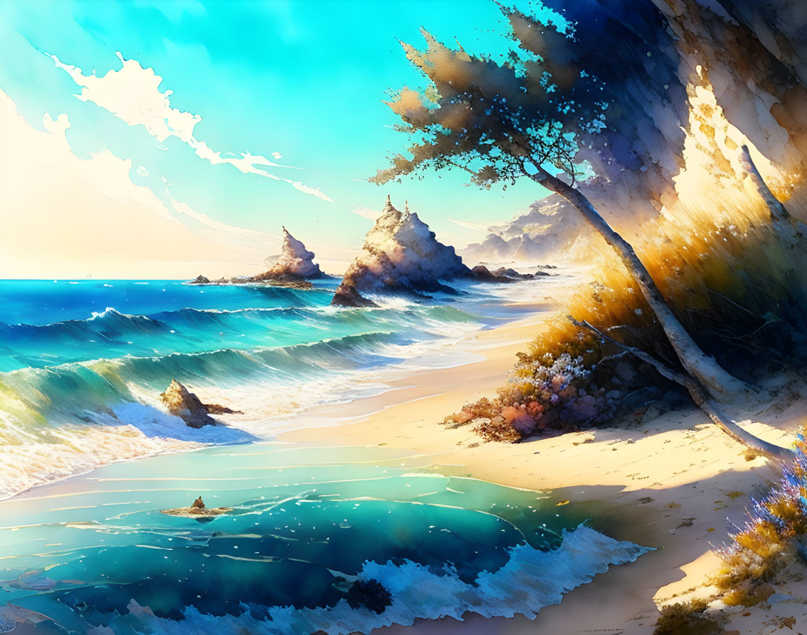 Scenic beach view with clear waters, crashing waves, rocky outcrop, weathered tree, sunny