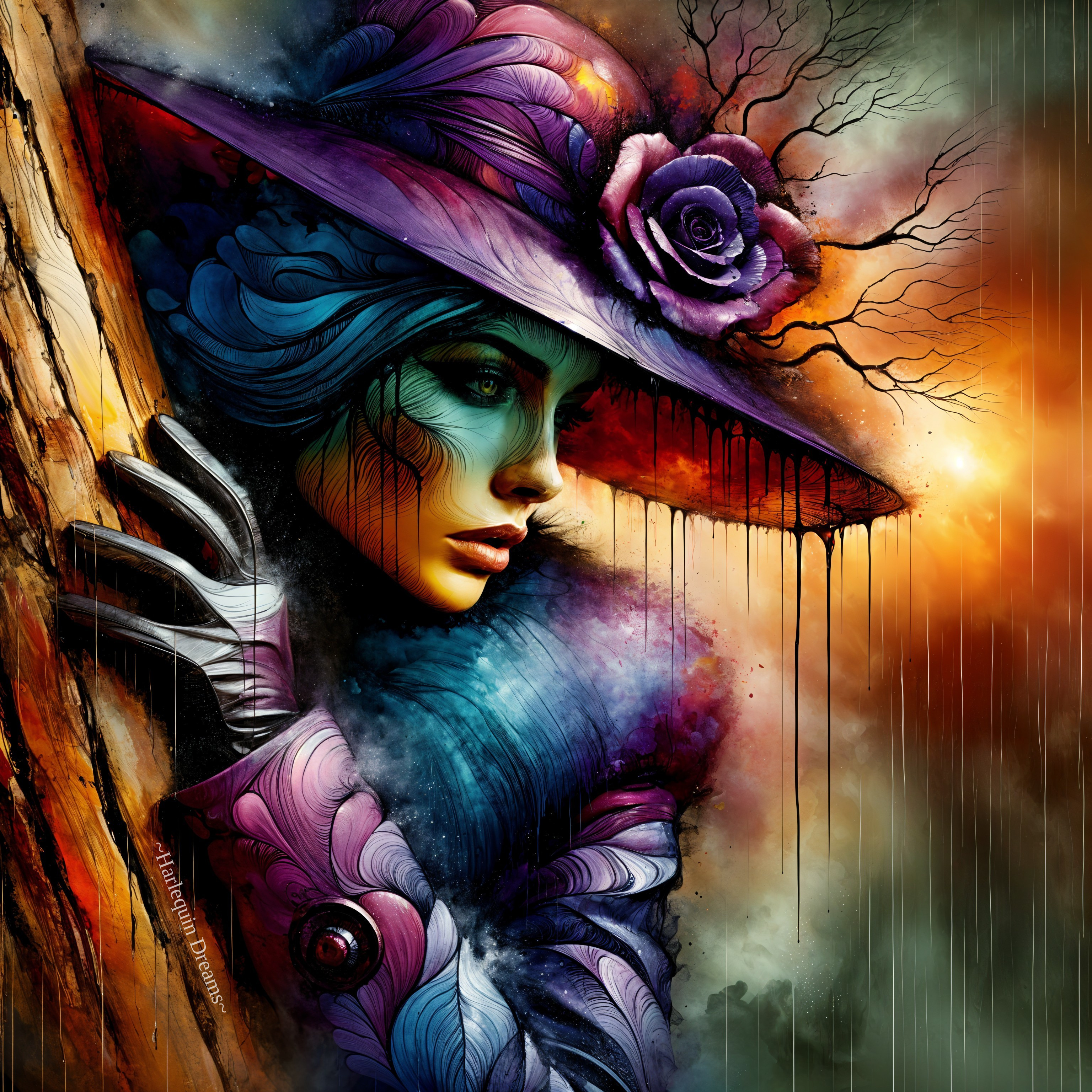 A striking, colorful portrait of a woman wearing a large hat adorned with a rose. Her vibrant hair and clothing blend with abstract elements, creating a dramatic, artistic atmosphere.