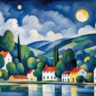 A vibrant landscape featuring rolling hills and colorful trees, with quaint houses by a shimmering lake under a starry night sky and a glowing moon, creating a tranquil and dreamy atmosphere.
