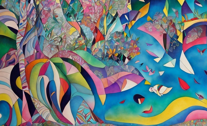 Prompt: Zentangle,birds,colourful river, trees, elegant, I awoke to a land saturated in fable and ancient lore as rich as the Dreamtime of the Australian aboriginals to whom every feature of the earth had its own story its own mythical resonance. surreal, beautiful acrylic art, watercolor patchwork, Picasso, Wassily Kandinsky, spirals and intricate patterns, contour lines.surrealism