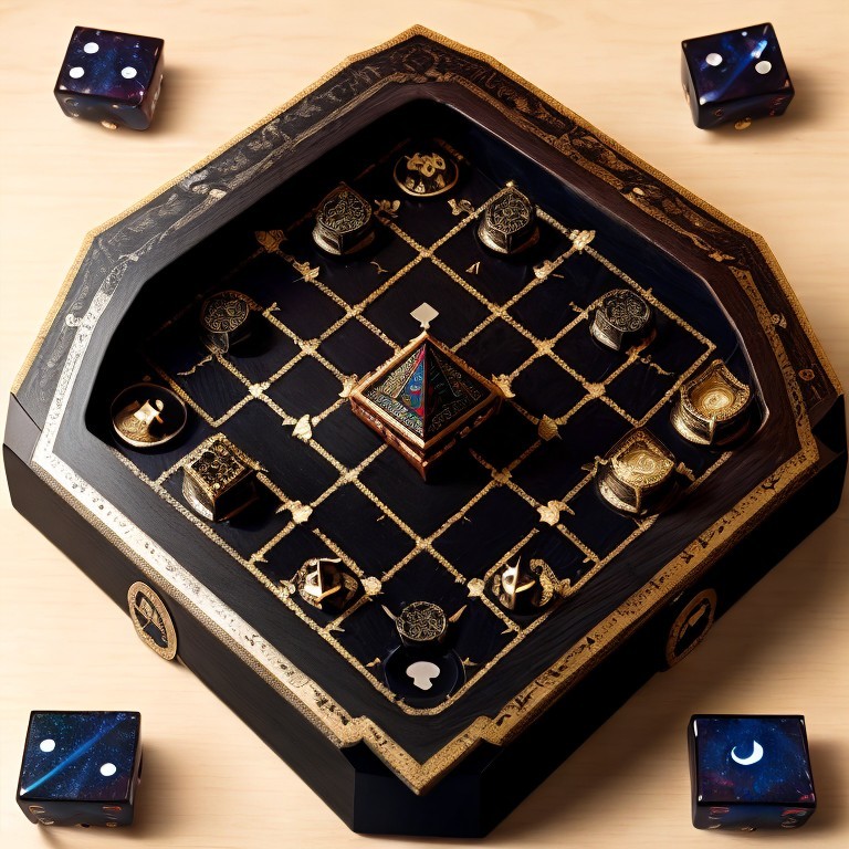 Prompt: ancient puzzle strategy board game on dark wood, step-by-step tabletop racing game with 2 dice and figurine-chips, Hnefatafl, mists, jewel decor, cabbalistic symbols; social realism by Vladimir Kush, Bosch, Esher, Antoni Gaudi, pre-raphaellites, surrealism detailed volumetric lighting, soft colors gamma, spot moon rays, game design concept