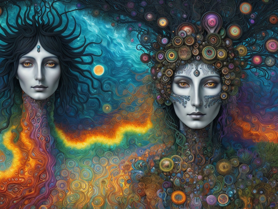 Digital painting. A portrait of a mystical being with flowing, organic shapes and intricate, Hundertwasser-inspired patterns. The being's form incorporates biomechanical Giger accents, and surreal Bosch-like creatures emerge from its surface. The background depicts a fantastical universe with elements reminiscent of Bogomil's art. Glowing cryptids are scattered throughout the scene. Bold, expressive brushstrokes, sharp, dynamic lines, dramatic lighting. Digital art, surrealism, best quality, a masterpiece, 8k resolution, trending on Artstation. Hans Bellmer's Dolls meet David Lynch Eraserhead in a colorful surreal film with scene sets by H.R. Giger with the Alien and Cthulhu, where a single sunflower sprouts from the lady in the radiator's head on the road to OZ following a frantic rabbit, Bellmer's cat did not survive and the cryptid taxidermy chicken rules in Bogomil's Universe, imperial colors, Alphonse Mucha Max Ernst surrealism art Nouveau oilpainting dynamic lighting Art of Illusion.