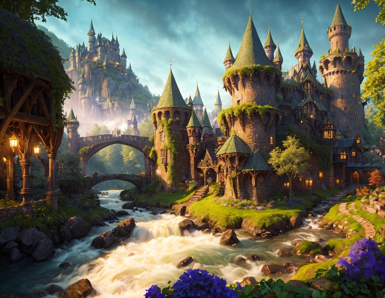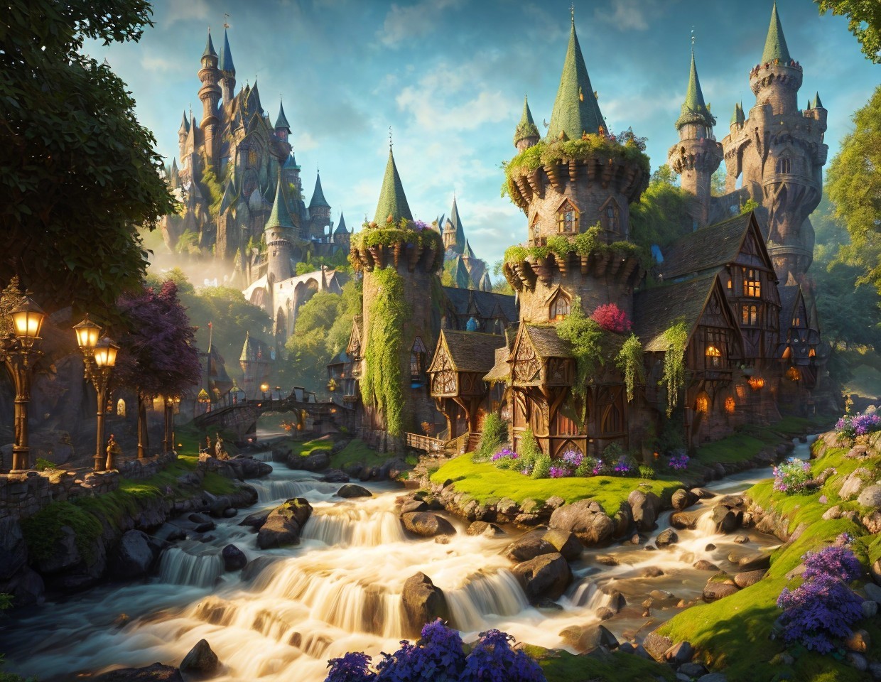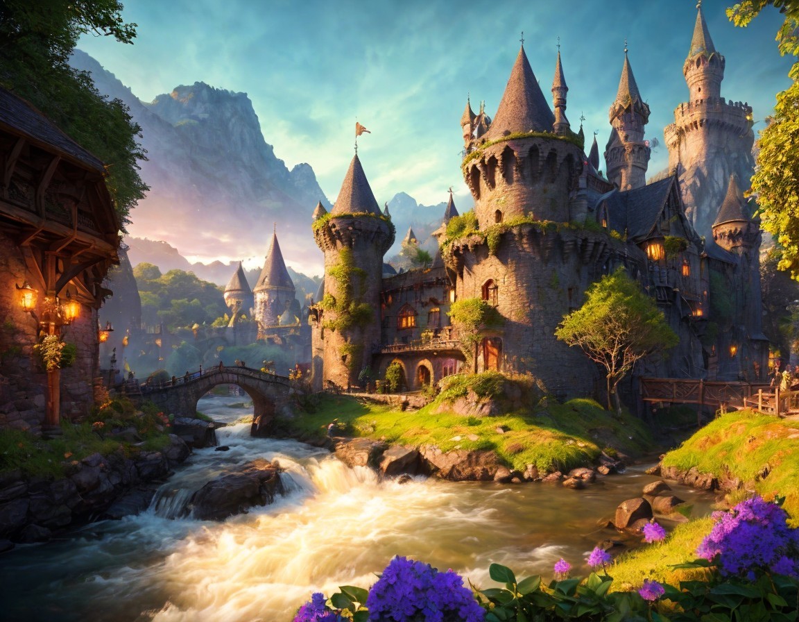 Prompt: "Medieval fantasy kingdom, Dreamland castle, cobblestone streets, towering spires, lush greenery, mystical forest, flowing river, magical creatures, vibrant market stalls, diverse architecture, intricate details, realistic textures, atmospheric lighting, day-to-night transition, rich color palette of royal blues, deep greens, golden yellows, and rustic browns, inspired by Renaissance art, high-resolution digital painting, enchanting and immersive setting, ArtStation showcase."