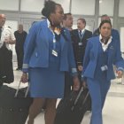 A surreal scene features a woman in a blue uniform alongside allies, their heads replaced by cats. The background hints at an airport setting, blending humor with a touch of the unexpected.