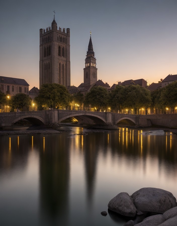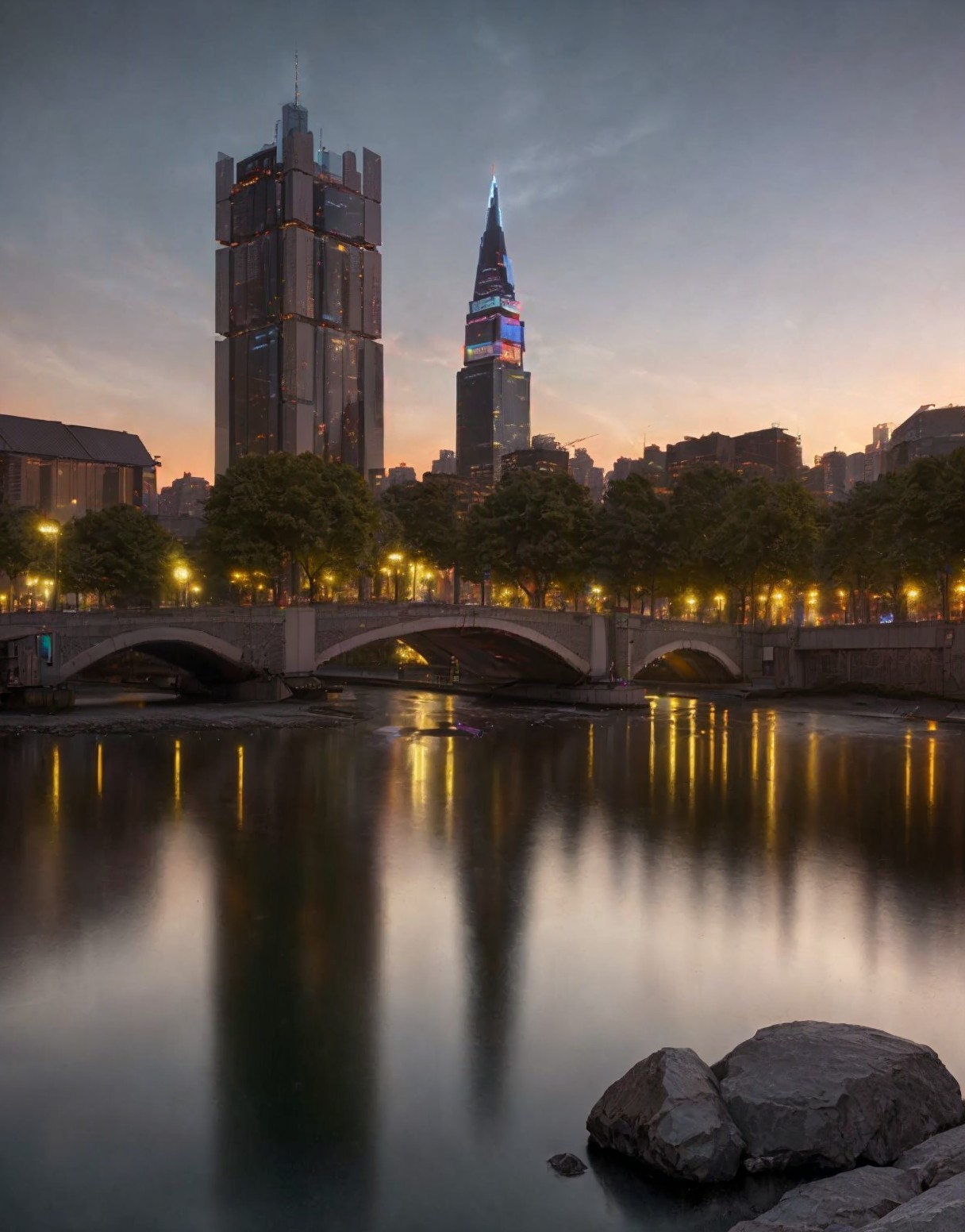 The image features a stunning skyline at sunset, showcasing sleek skyscrapers reflecting in a calm river. Lights illuminate the scene, creating a serene atmosphere under a colorful sky.