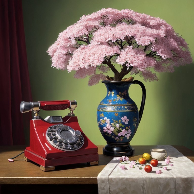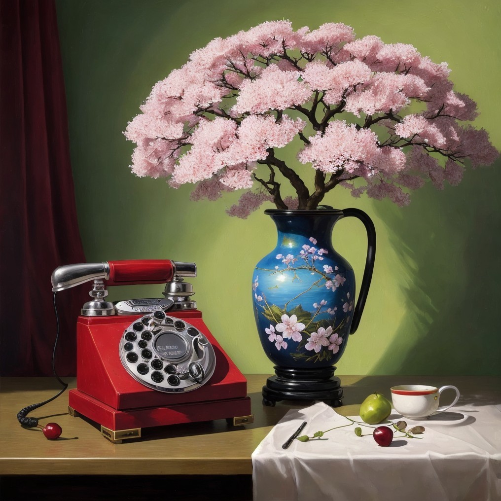 A vintage red phone beside a blue vase with pink blossoms, tea set on a table against a green background.