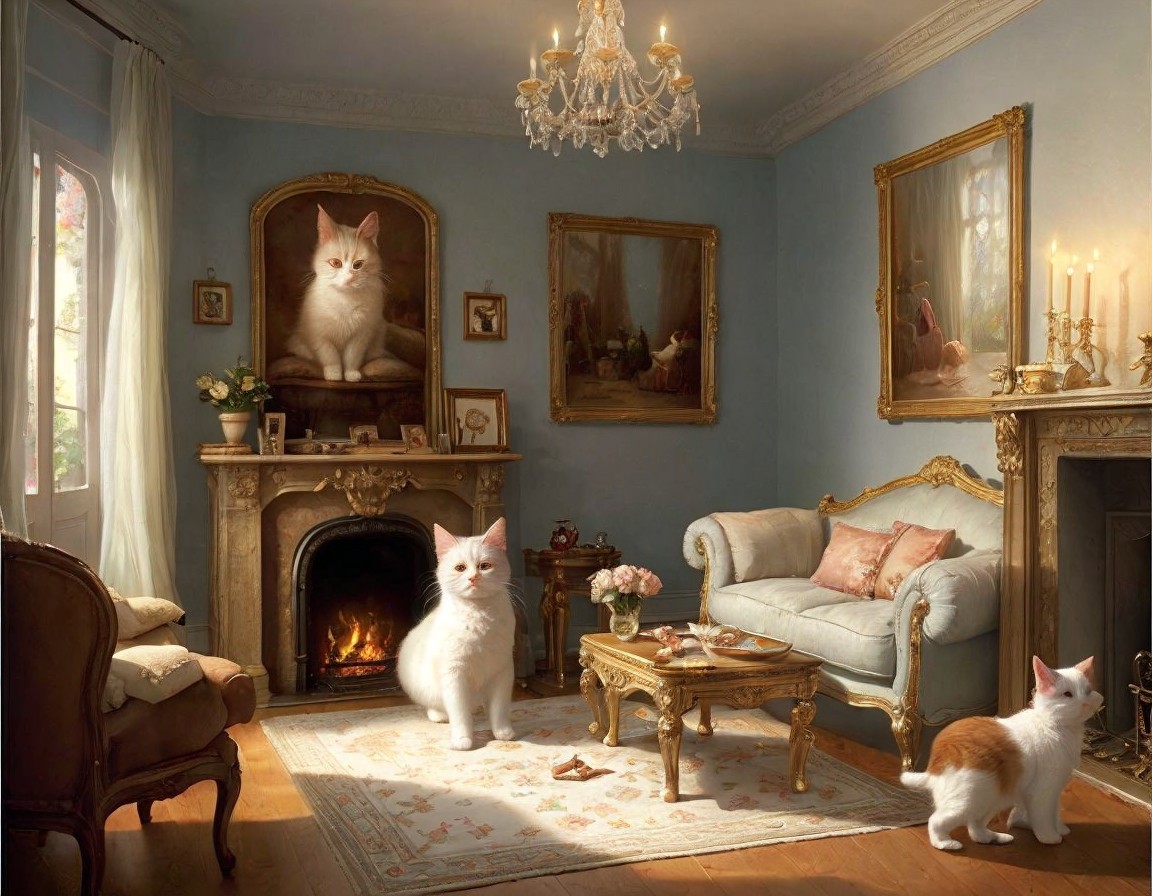 An elegant room with a fireplace, ornate furniture, and two cats amidst paintings depicting outdoor scenes.