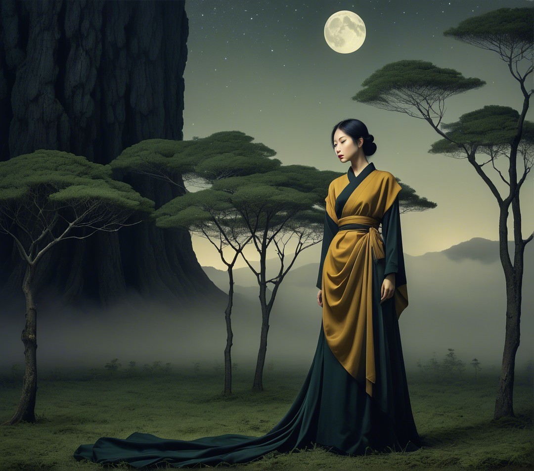 A figure draped in a flowing dress stands in a misty forest, facing two glowing moons. Tall trees surround the scene, creating an ethereal and mysterious atmosphere.