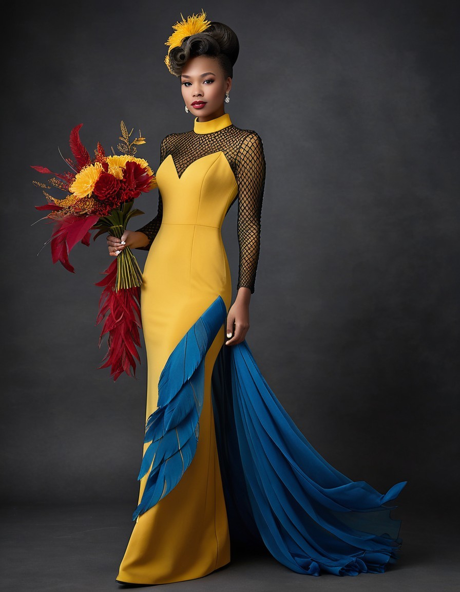A model showcases an elegant yellow gown with a fitted silhouette and a dramatic blue train. The dress features black netted sleeves, complemented by vibrant flowers and a bouquet.