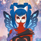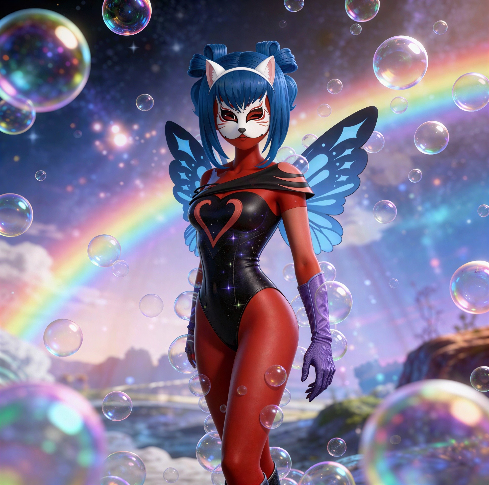A young woman with dark red skin and dark blue hair styled into two buns on the top of her head stands facing forward with a white cat-eared headband and a red, black and white cat mask covering her eyes, nose, and mouth. She wears a one-piece outfit that is black with gold highlights.