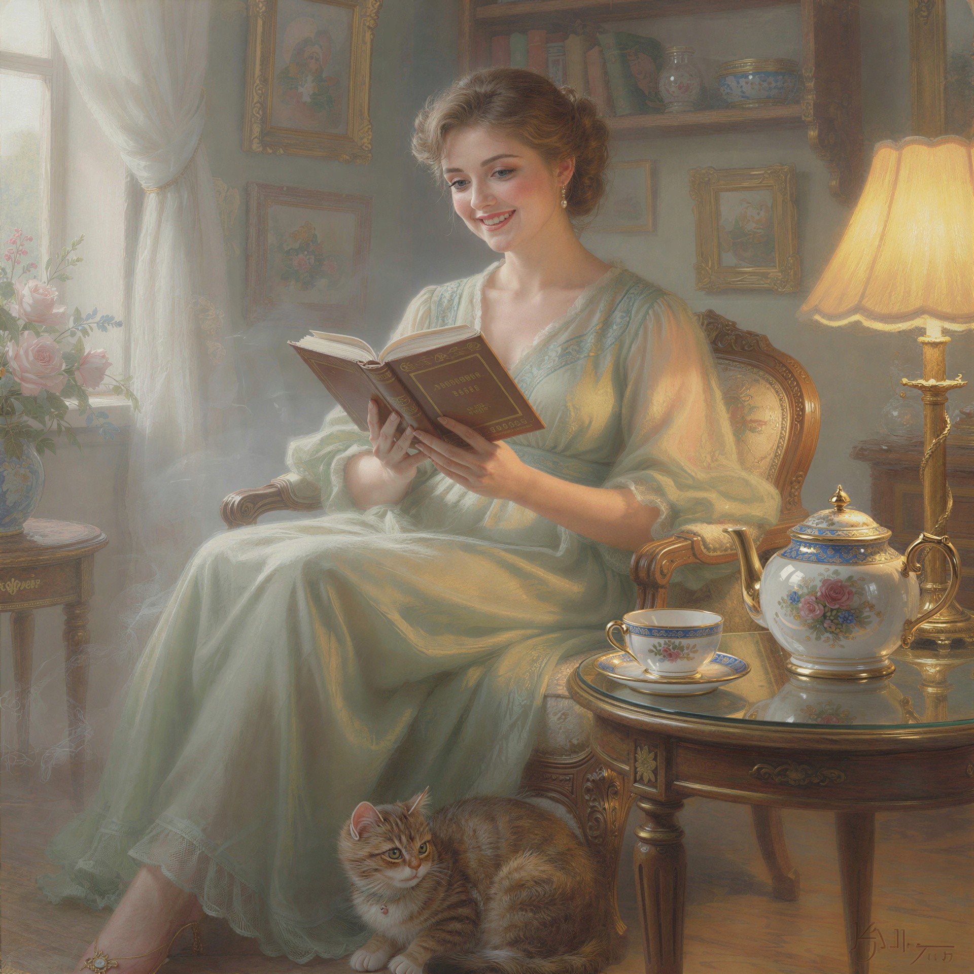 A highly detailed oil painting depicts a young woman in an elegant living room, bathed in gentle light from the window to her left and a table lamp to her right. She sits in a high-backed armchair, wearing a light aqua historical dress with lace trim, smiling as she reads a book titled "