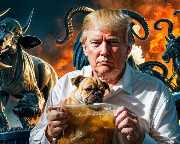 The image features a Putin's comrade holding a bag of fries, surrounded by dogs, smoke, and explosions, with a dramatic backdrop including a U.S. flag and military elements. It evokes a chaotic, surreal scene.