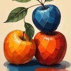 A vibrant, geometric representation of three apples in bold colors—blue, green, and orange—set against a neutral background, showcasing a modern, artistic style.