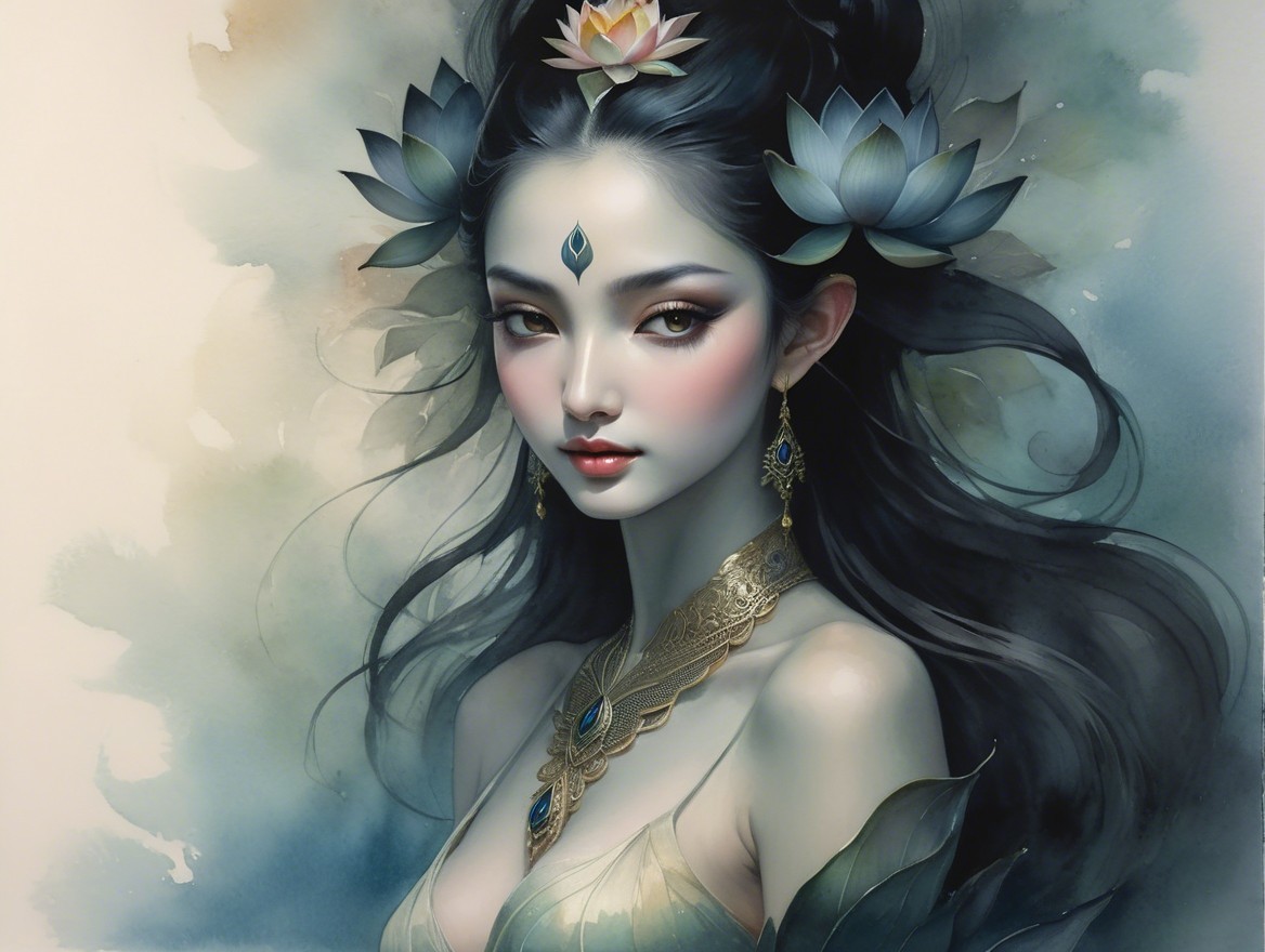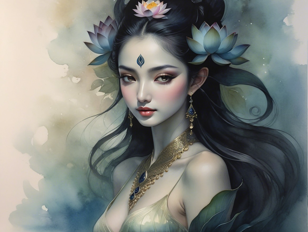 A stunning, ethereal woman adorned with lotus flowers, wearing intricate jewelry and a flowing garment. Her serene expression and graceful features evoke an aura of calm and beauty.