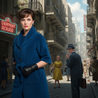 A stylish woman in a blue coat and gloves stands confidently on a vibrant street. In the background, a man in a suit glances back, while shops add to the lively atmosphere of the scene.