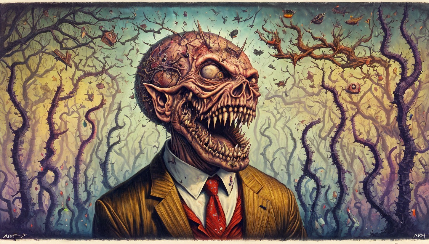 Monochrome painting of crowned woman with scepter in ruins landscape