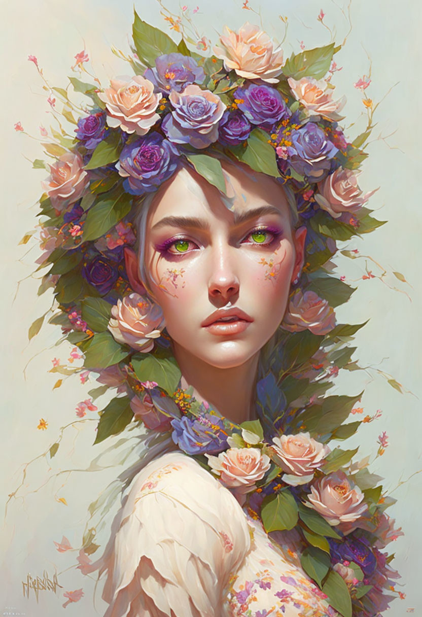 pltn style, a woman with a wreath of flowers on her head, pixie, hyperdetalized painting, complex portrait of the head and shoulders, concept art portrait with 4k resolution by Greg Rutkowski, Artgerm, Unreal Engine 5, beautiful symmetrical face, green eyes, pop, elegant, clear, deep colors, fantasy, airbrushing, rendering Pixar, cinematic smoothness.