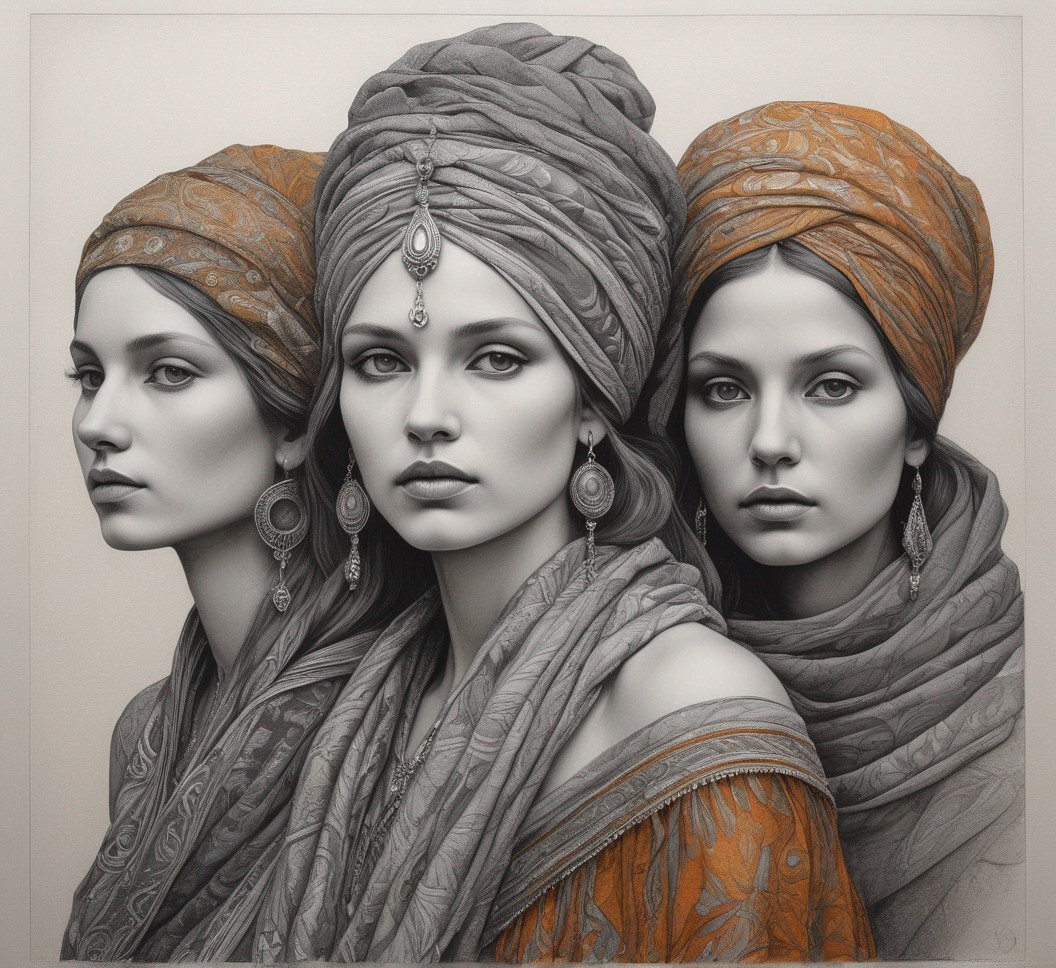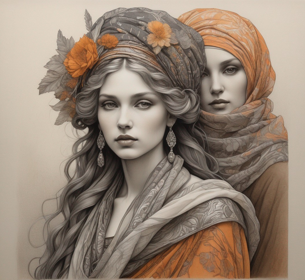 Monochromatic artwork of two women with ornate head wraps and detailed shawls, both gazing intently towards the viewer.