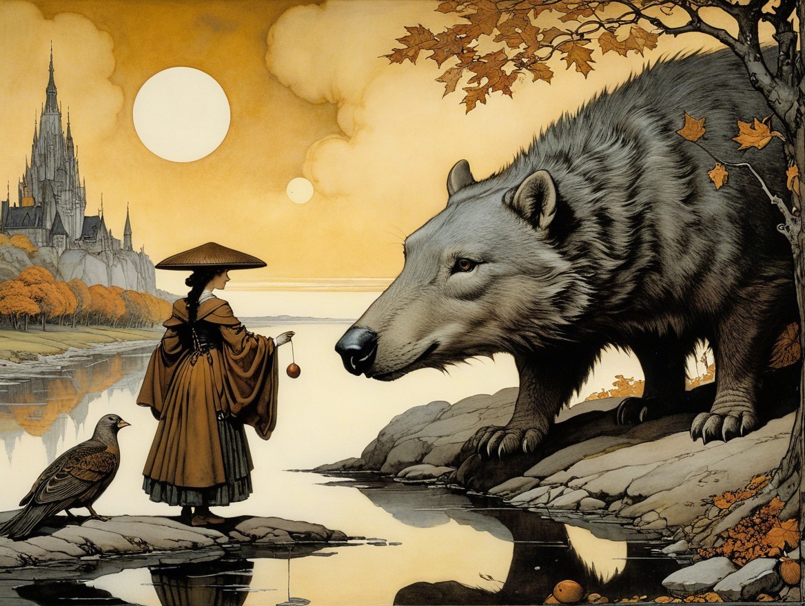 A serene landscape features towering trees with autumn foliage, reflecting in a calm river under a golden sky. The sun sets behind distant hills, creating a peaceful ambiance.