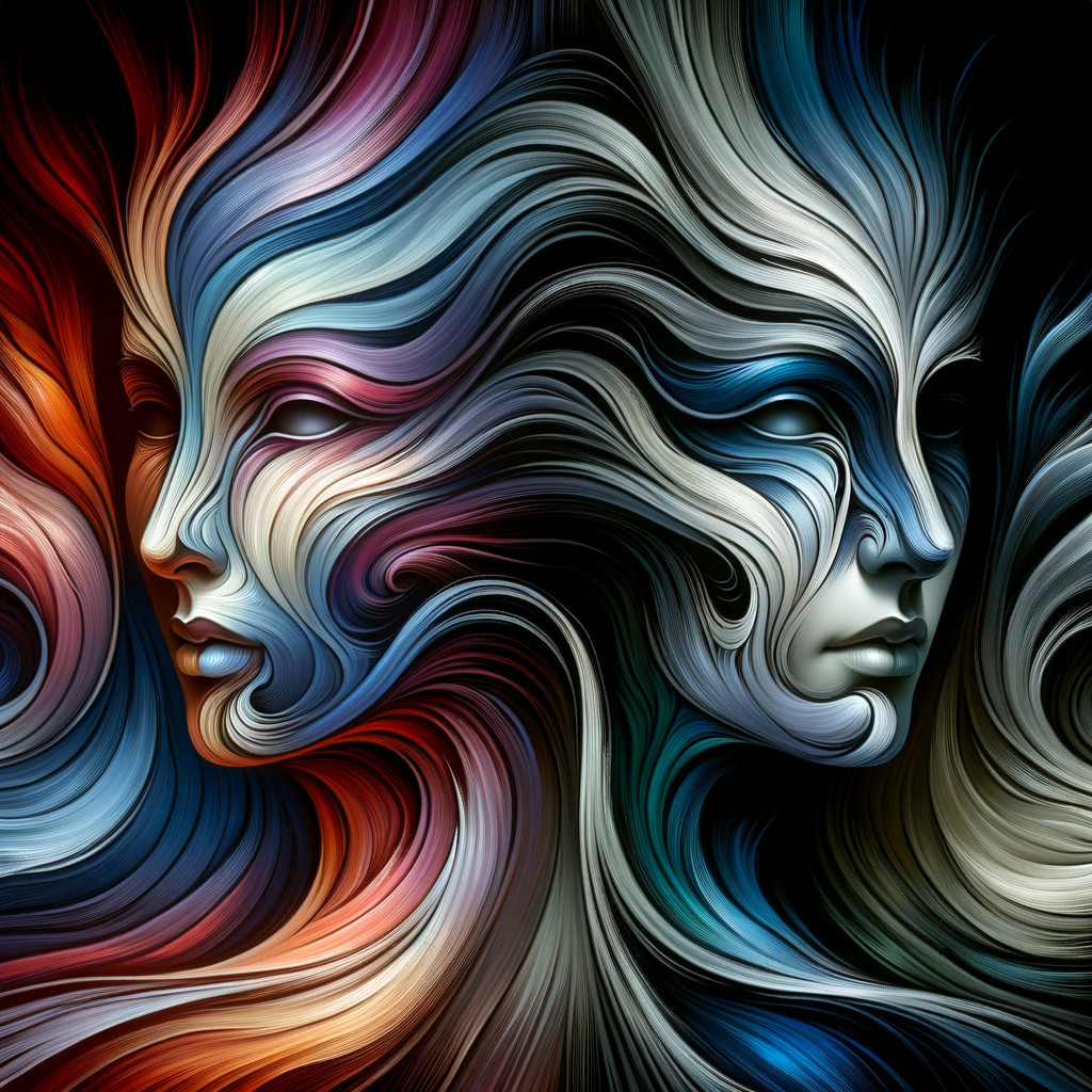 The image features two stylized faces intertwined with vibrant, flowing colors and intricate patterns, conveying a sense of harmony and duality in a surreal artistic expression.