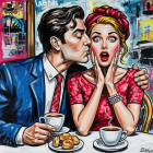 A stylish couple shares an intimate moment at a café, with the man kissing the surprised woman. They enjoy coffee and pastries, surrounded by vibrant, colorful artwork in the background.