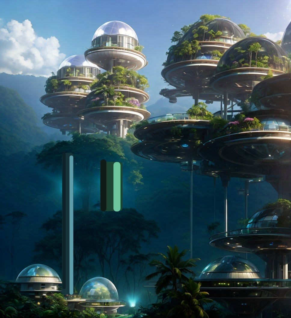 + Prompt:Three futuristic round multi-storey houses with a transparent dome, with glowing windows, in a tropical valley, among green overgrowth and tropical trees, a spaceship next to the house, in the rays of the rising sun, concept art with 16L resolution, extremely detailed, high definition, photorealistic, Thomas Kincaid, Ferdinand Knab, Niki Boehme