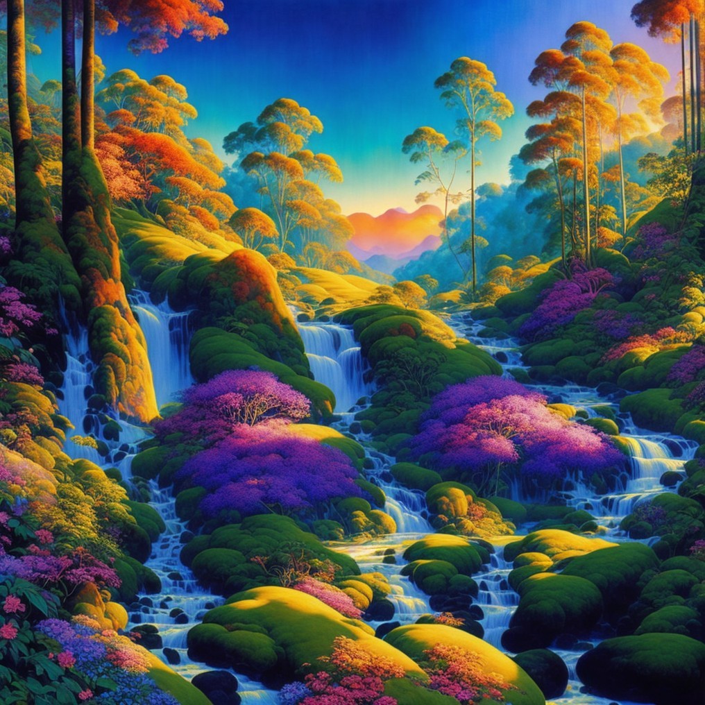 Prompt: wide view, full page, single image, 3D watercolor Patchwork, high definition, spectacular sunrise, rainforest, stream, numerous flowers with vibrant saturated colors, slender trees, glistening magic style, by Maxfield Parrish, with elements in the style of Jan Toorop