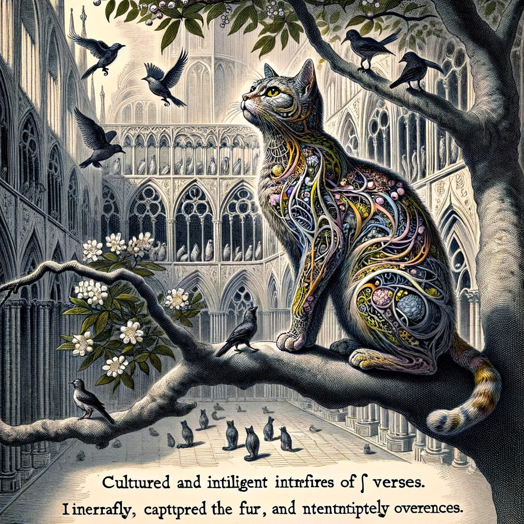 Prompt: a cat, sitting in a jasmine tree in the inner yard of a gothic cathedral. Of course this cat is very intelligent and cultured - she's up in the tree because the birds are chirping poetry and she's there to listen and enjoy. She first walked through the interior of the cathedral and her fur picked up some frankincense (she tried to lick it off of her fur, but the dampness made it stronger).