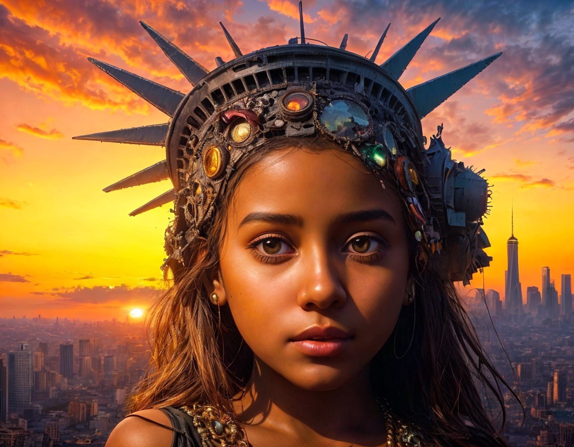 Hypnotized by the sunset-kissed ruins, a small girl's back turned towards us gazes at a city in shambles, the dismembered bust of the Statue of Liberty jutting out amongst the debris, oil painting style as if crafted by the likes of Igor Morski or Vladimir Kush on a canvas, hyper-realistic and intricately detailed, cloaked in an air of mystery, 8K resolution, matte painting with crisp lines and textures, a digital
