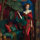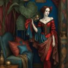 A woman in a richly decorated gown stands in a warmly lit room, holding a balance scale. Elegant decor, a cat, and a clock enhance the enchanting, vintage atmosphere of the scene.