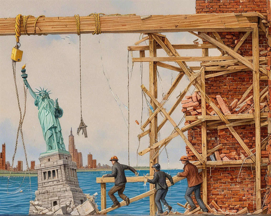 Prompt: Illustration of chaos, colored pencil drawing, workers flee from the crumbling construction site on the seashore and jump in panic into the windswept water, the Statue of Liberty tips to the side, crying loudly, a high stack of bricks tips over, individual bricks fly down, torn ropes hang from the broken top plank of a brittle wooden scaffold, a crooked pulley, the gray marble foundation crumbles and collapses as if in an earthquake, to the side an unfinished, carelessly built brick wall with holes, smog, dark clouds, in the style of Albrecht Altdorfer