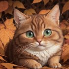 A fluffy ginger cat with green eyes enjoys the last of the autumn leaves.