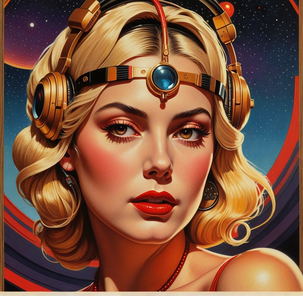 The image features a stylized, glamorous woman with blonde hair and striking makeup. She wears futuristic headphones and a vibrant red outfit, set against a cosmic background.