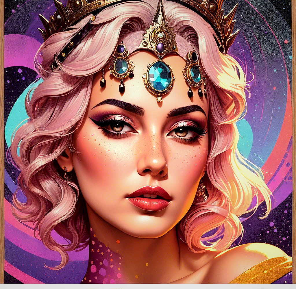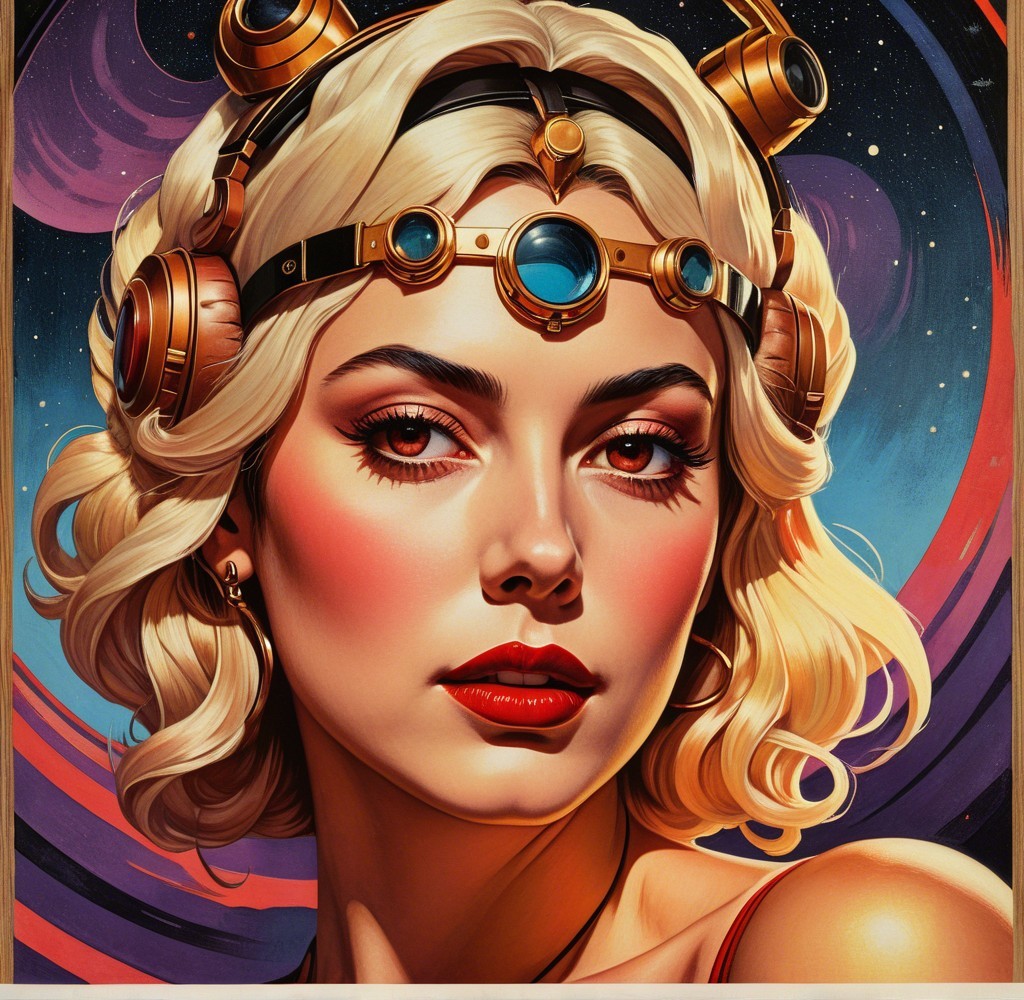 Prompt: Dark Fantasy art, retropunk, sweaty queen of the nightmarish, headset, coronet, golden-red color scheme portrait in lowbrow style merged with movie poster art, pointillism, hues of Edward Hopper, intricate, surrealistic science fiction style, Stylized woodblock print by William Bradley and Albert Bierstadt, hot wax merged with gouache, headshot, tesselated, sculpted, celestial background with tiny features, rim lighting, close-up, folded paper style, Pulp art, book cover art by Earl Moran, stan lee and Haddon Sundblom,1930s pulp adventure magazine,hues by barclay shaw and Bob Larkin, E.C. horror comics 1950s,1950s space age style collage, american gothic 1.3, tetradic color scheme beige red ochre, colored line patterns, brightness 1.4, divisionism, plasticity 1.3, scruffy, beautiful coloring in red black and beige, Stylized, quilling, tesselated, smeary, tactile, 1940s advertisements style by Edward Hopper, expired film, xeroxed with Ilford Sprite 35-ii Reusable camera, push processing technique, grungy, sculpted, eroticism, crisp quality, uhd hdr, octane render, foampunk 1.7, dynamic lighting 1.2, parallax occlusion 1.2, squiggly strokes, spiritual essence, synthetic, serene expression, flecks, splashes, dots,silver particles, kintsugi details,