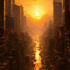 A bustling urban landscape at sunset, with towering skyscrapers lining a busy street. The golden light reflects off the wet pavement, creating a vibrant, atmospheric scene.