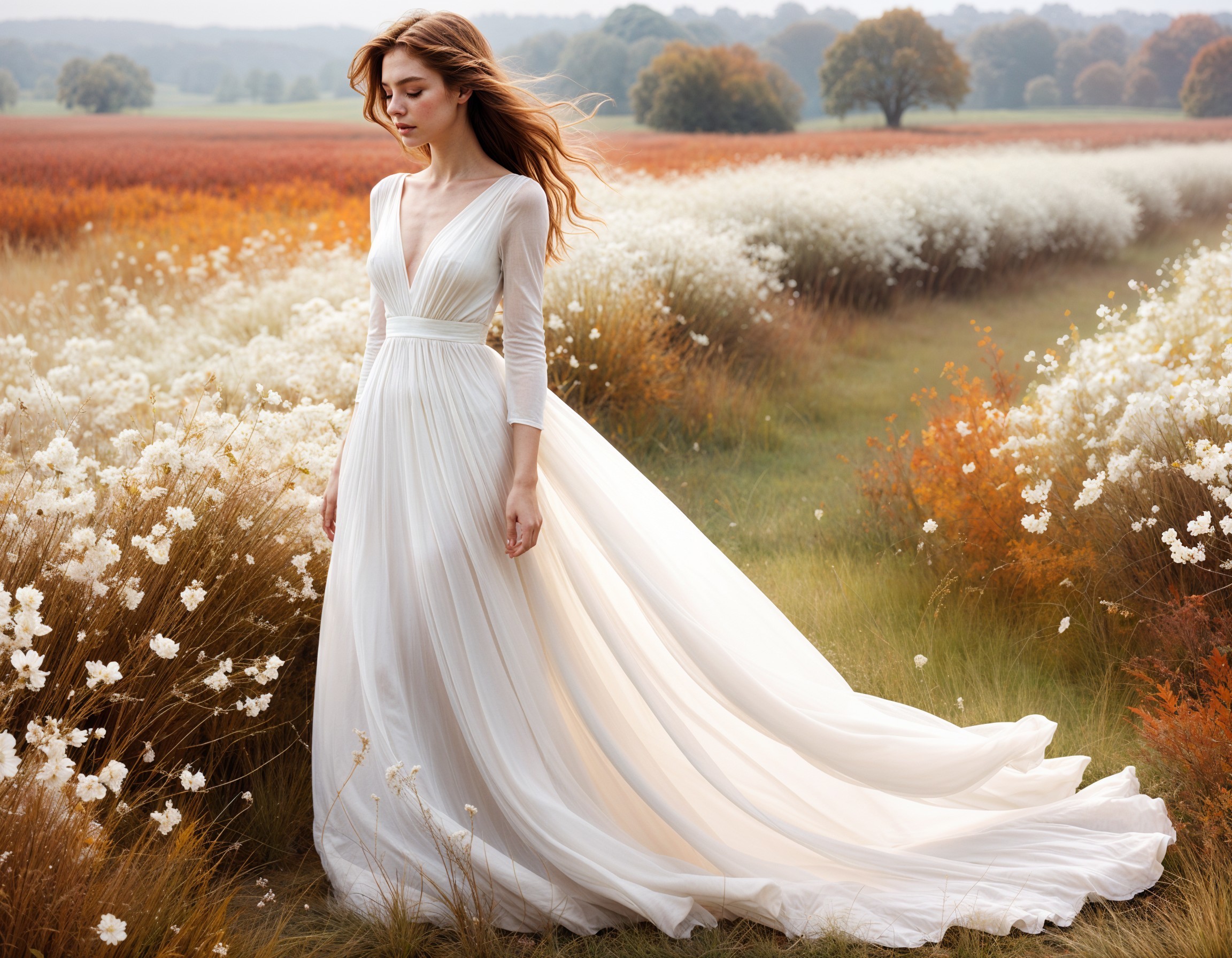A woman in a flowing white dress strolls through a serene meadow dotted with fluffy flowers, bathed in soft light. The backdrop features gentle hills and a tranquil, dreamy atmosphere.