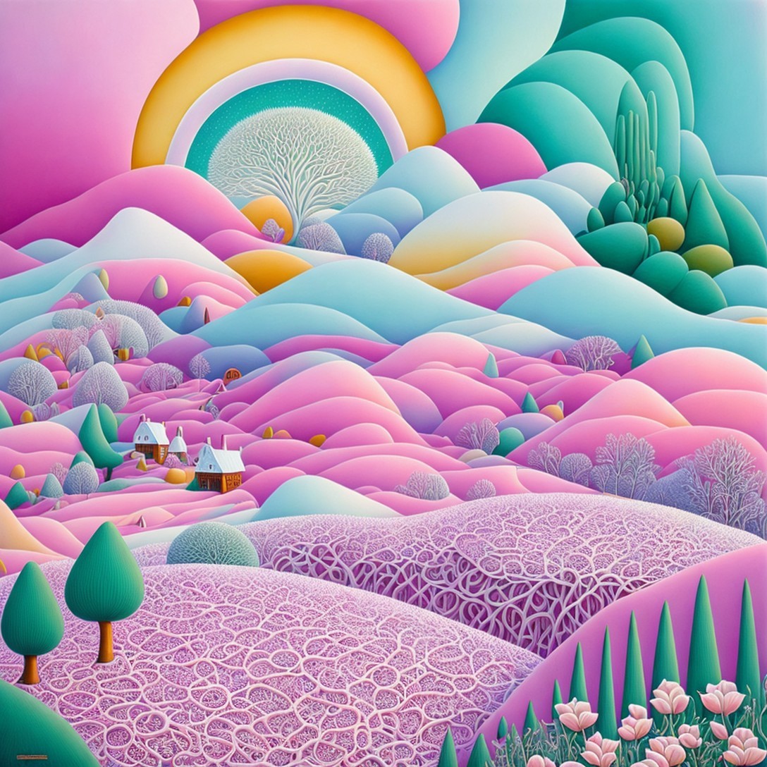 A whimsical landscape filled with pastel-colored hills and whimsical trees. Dreamy villages nestle in the vibrant terrain, illuminated by a surreal, glowing sun. A tranquil, magical scene.