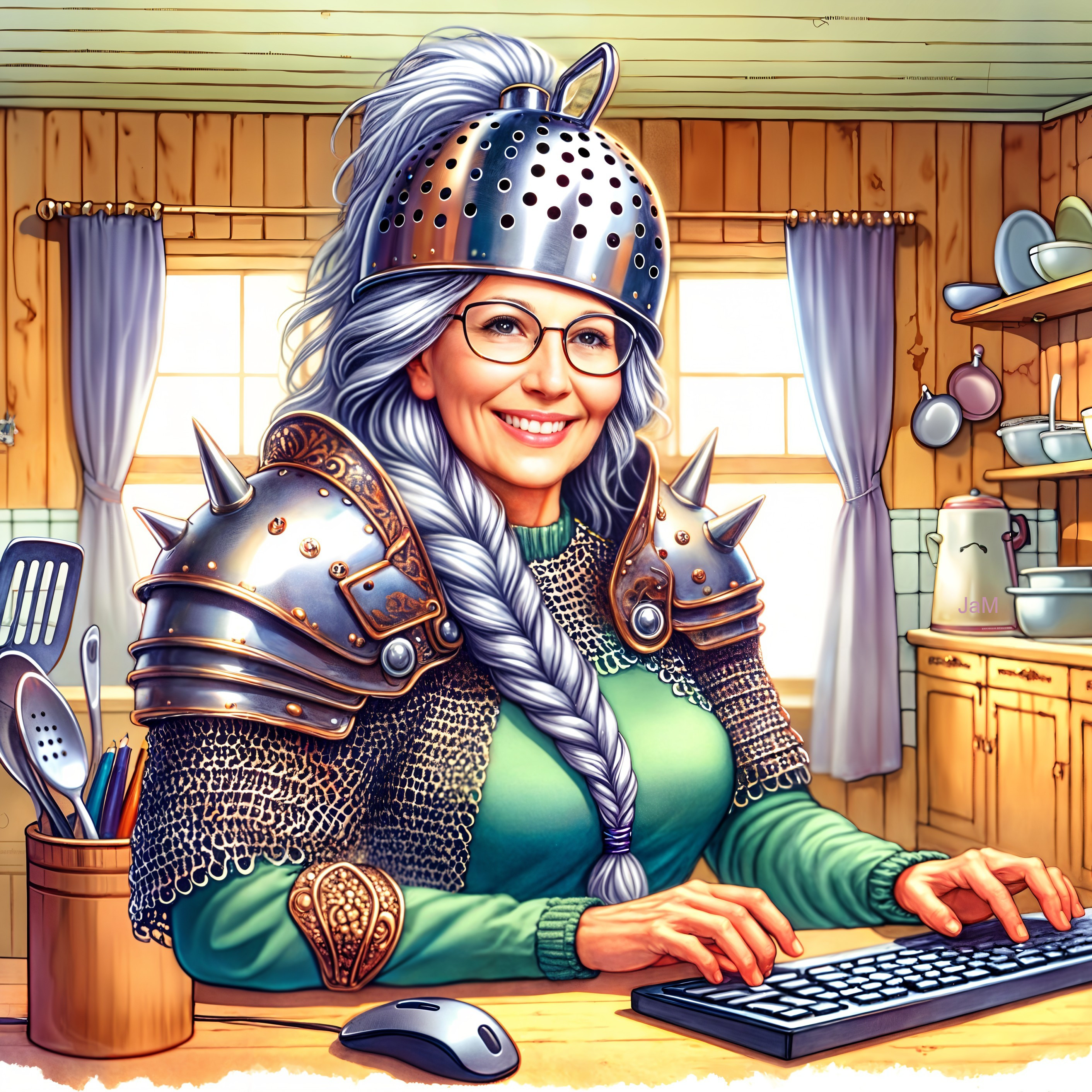 A whimsical illustration features a cheerful fifty-year-old woman in a cozy kitchen, adorned in armor made of kitchen utensils, wielding a keyboard, exuding confidence and charm in vibrant colors. Prompt by JaM