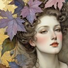 A beautiful young woman with wavy hair adorned with colorful autumn leaves. Her gentle expression contrasts with the vibrant foliage, creating a serene and whimsical atmosphere.