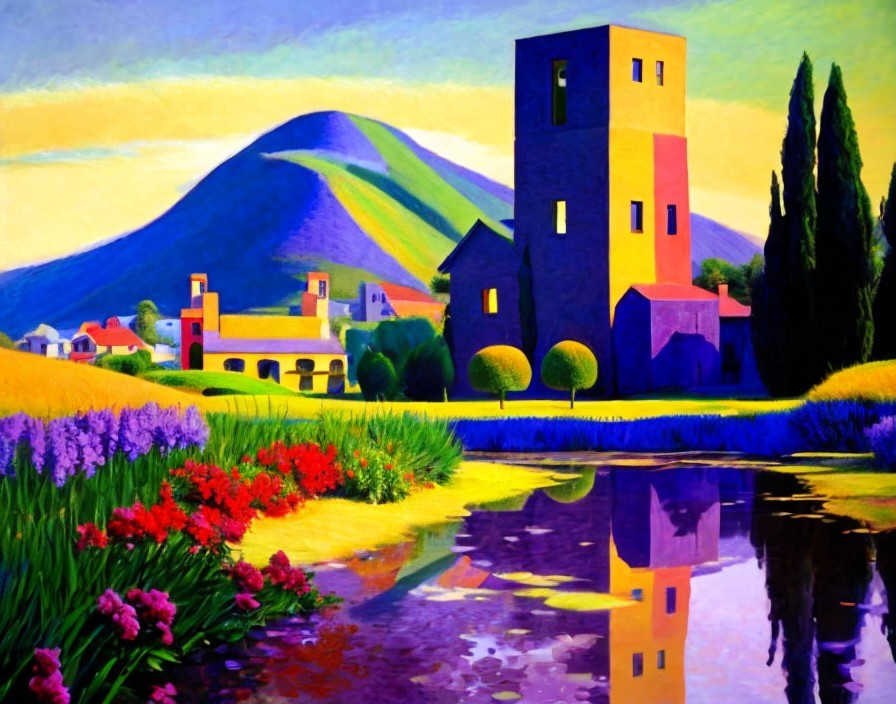 Colorful landscape painting: serene pond, vibrant flowers, rolling hills, cypress trees.