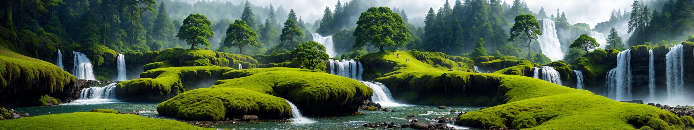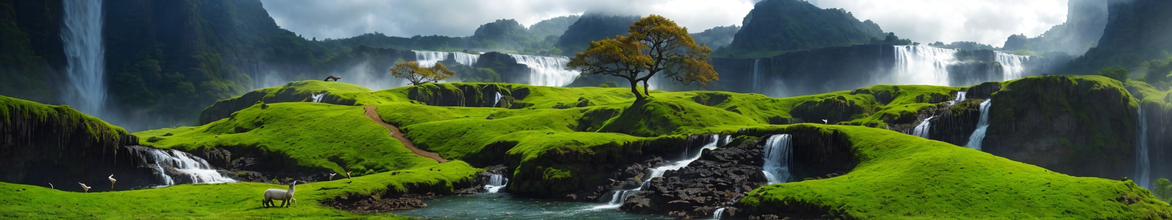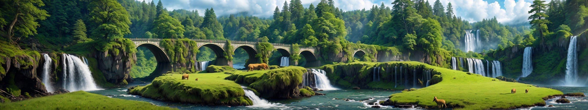 Lush Green Landscape with Waterfalls, Bridge, Hills, and Grazing Horse