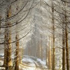 A picturesque winter scene featuring a majestic castle atop a snowy hill, surrounded by tall trees and a quaint village at its base, evoking a serene and magical atmosphere.