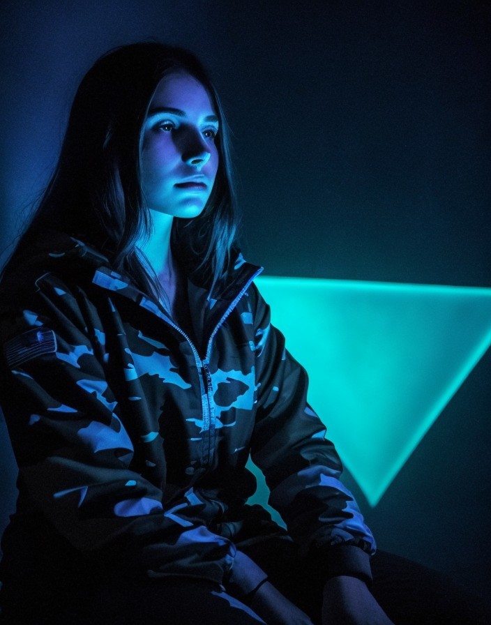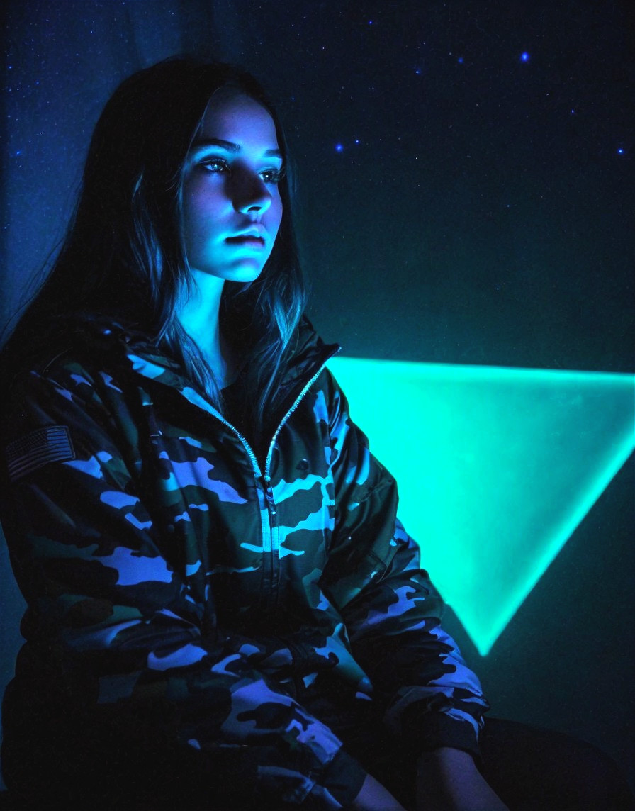 A woman in a camo jacket looks contemplatively under blue light with glowing stars in the background.