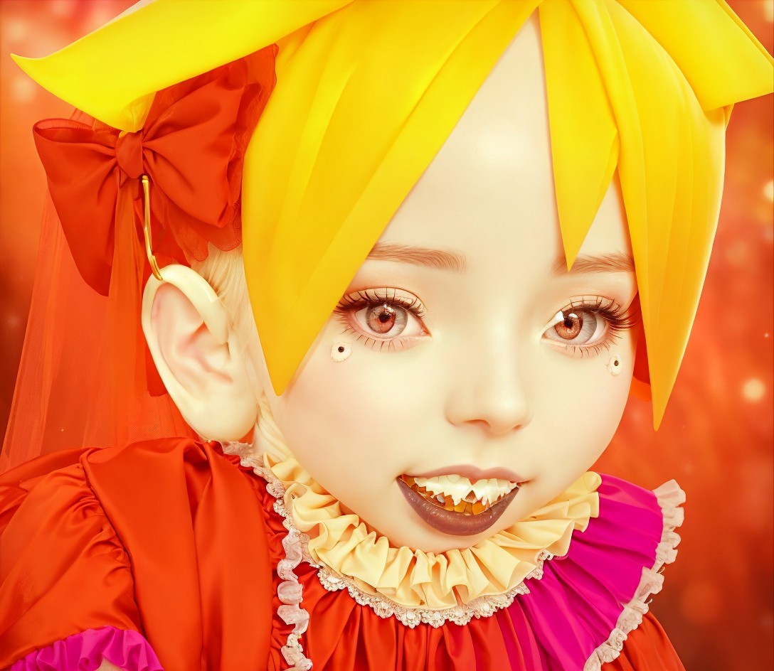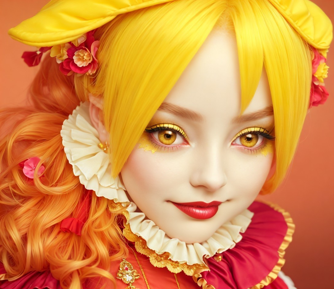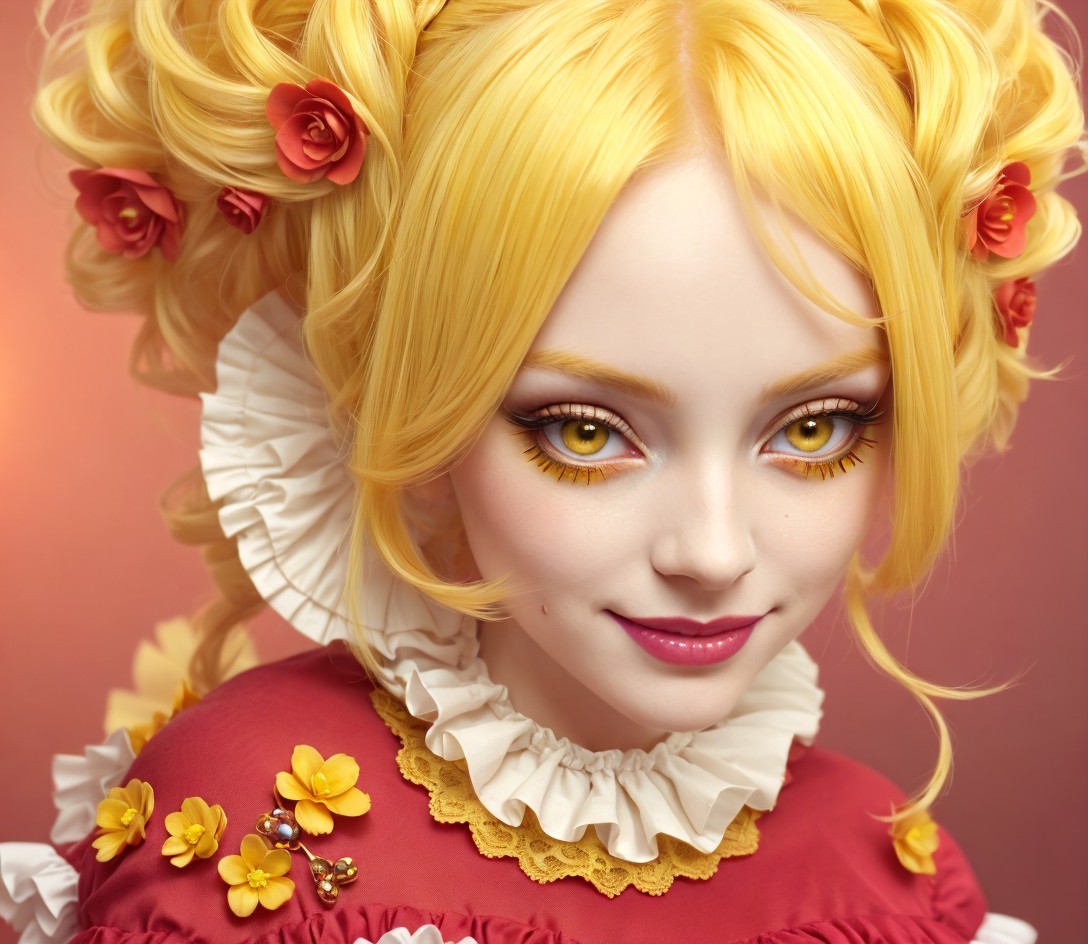 Female empress in plushy frilly dress, playful smile, crochets, contraptions, pale skin, gothical make up, detailed close-up portraiture, top to bottom angle, beautiful queen, triadic color scheme yellow red beige, blonde stylized hair, anglocore, bioluminiscent eyes, octane render, cottagegore, dreamscape, yellow rim lighting 1.25, realistic mouth, anatomical accuracy, brightness 1.4 translucent , detailed nose and eyes, volumetric plushy psychpomp, dynamic lighting 1.7, magnificent, 3d effects 1.8, adorable, spiritual, gorgeous, attractive elegance,, cracked porcelain, high details, Schreger lines 1.7, chaotic background, ambient occlusion 1.5, embossed flares, finest strokes, tints of 1970s fantasy art, highly detailed ornamental features, tints of 1950s book cover art, , illustrative maximalism, tints of movie poster art, vector 9:5, grain, kinetic zentangle lines intertwined with background, high coloring 1.9, raytraced,