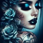 A striking portrait of a woman with vibrant blue eye makeup and glossy lips. Artistic floral designs adorn her face, complemented by shimmering droplets and soft, ethereal lighting.