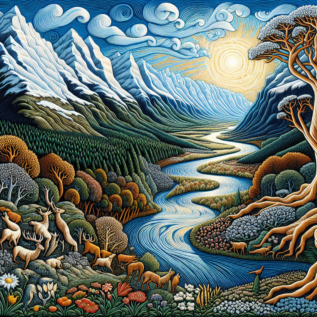 Prompt: Intricate scratch art masterpiece, cold wax painting technique, detailed and delicate crayon etching, winding river landscape with snow-capped mountains and blue skies, wildlife and wildflowers, fine and delicate lines, linocut allure, styled reminiscent of Leslie White and naive artists, high detail, intricate textures, vibrant colors, nature-inspired palette, sharp focus, warm lighting, Artstation.