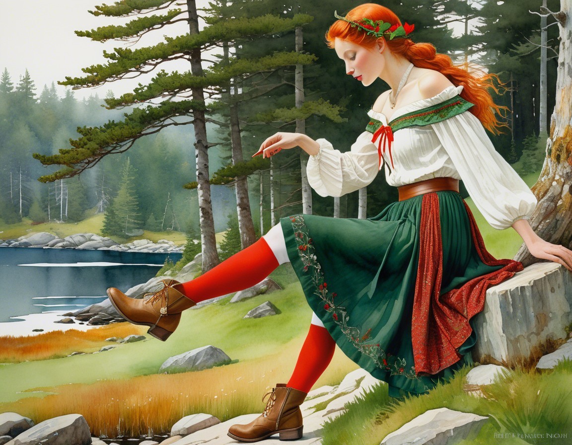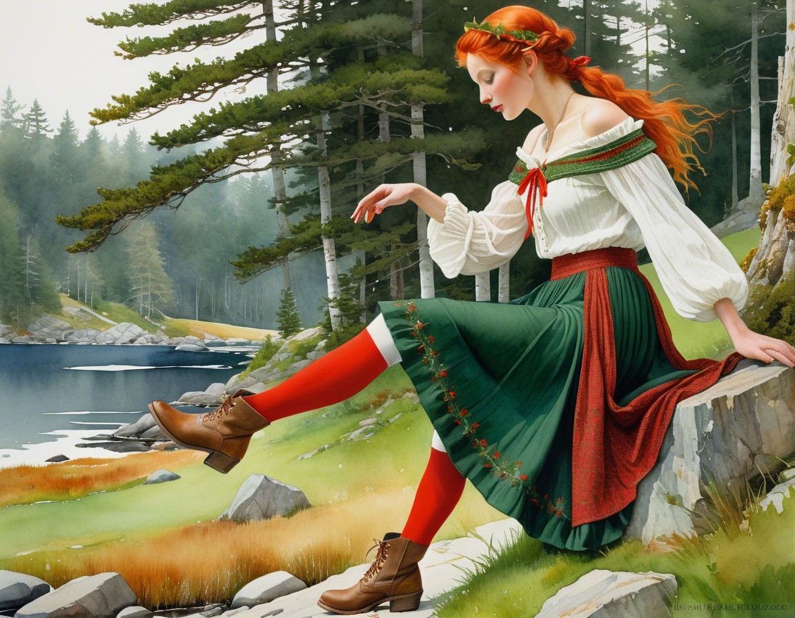 A young woman in a traditional outfit sits by a serene lakeside, her vibrant red hair flowing and her green skirt contrasting with the natural scenery of trees and water around her.