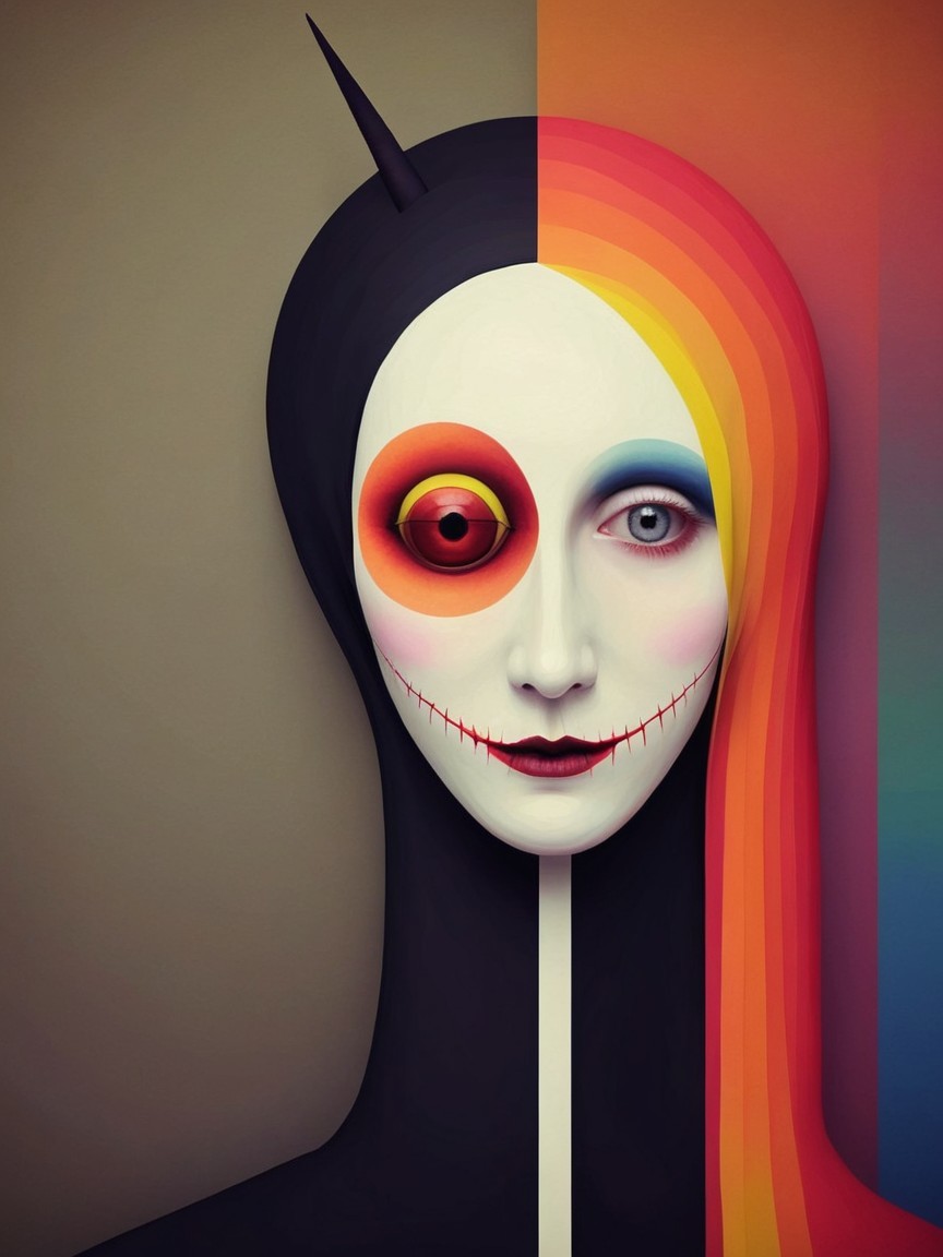 Prompt: [mid century modern style. Bold use of flat planes of color flat colours , drawing] Eye see Me Weird Art for Weird People {It's Natural to Be Afraid of Nuclear_Fart_Unicorn_Puffin_Smiley_The_Moaning_Demiurge : by LEBO artwork, Seurat, Redon, Scarfe}_{Exaggerated Weird NECRO Slut For October!} Partly, that’s because hyperreal itself is so oddly uncanny unsettling! Unique and heady mix of science and magic, science fiction and gothic romanticism of a post-apocalyptic vision. viewed triple above water and triple underwater and triple under oil, blown off out of exaggerated.